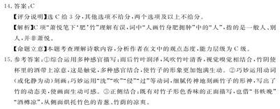 苏轼① 元丰六年七月六日,王文甫家饮酸白酒,大辞,集古句②作墨竹词。 雨洗娟娟嫩叶光,凤吹细细绿筠香。秀色乱侵书帙晩,帘卷,清阴微过酒莩凉。 人画竹身肥拥肿,何用?先生落笔胜萧郎③。记得小轩岑寂夜,廊下,月和疏影上东窗。 【注】①当时苏轼谪居黄州。②本词截取杜甫《严郑公宅同咏竹》、白居易《画竹歌并引》曹希《墨竹》中的部分诗句拼集面成。③萧郎·指唐代画家萧悦,善画竹。 14.下面对这首词的赏析,不正确的一项是(3分 A.作者集用他人诗句作词,写自己眼中之竹,自然贴切给人耳目一新的感觉。 B.上阙中“秀”字照应“雨洗”暗写雨后竹子的光泽,“乱”字则照应“风”。 C.下阕中“先生”指王文甫,他画的竹子很形象,比萧悦笔下“肥”竹更胜一筹。 D.苏轼借笔下的“墨竹”,暗表自己虽处于人生低谷,但依然保持着高洁的情怀。 15.作者采用集句诗的方式将竹子描写得形神毕肖。这些诗句是怎样描写竹子的?请结合上阕相关诗句简要分析。(6分) 参考答案 14、C 15、综合运用多种感官描写;巧妙运用动词刻画;正侧结合。
