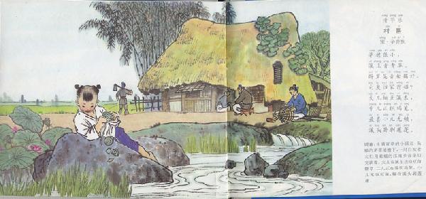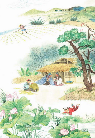 辛弃疾 茅檐低小,溪上青青草。 醉里吴音相媚好,白发谁家翁媪? 大儿锄豆溪东,中儿正织鸡笼。 最喜小儿无赖,溪头卧剥莲蓬。 ![]() [注释] ①:媪:音奥上声,老之韵。于老妇之敬称。 ②:无赖:无奈。顽皮。 1.清平乐 村居:清平乐,词牌名。村居,这首词的题目,意为乡村生活。“乐”在此处读yuè。 2.茅檐:茅屋 ,茅屋的屋檐。 3.吴音:作者当时住在江西东部的上饶,这一带古时是吴国的领土,所以称这一带的方言为吴音,吴地的方言。 4.相媚好:这里指互相逗趣、取乐。 5.翁媪(ǎo):老翁、老太。 6.锄豆:在豆地里锄草。 7.织:编织,文中指编织鸡笼。 8.亡赖:同“无赖”,“亡”读wu,这里指顽皮、淘气。 9.卧:趴。 10.卧剥:趴着剥(莲蓬)。 11.溪东:小溪的东面。 12.莲蓬:莲花开过后的花托,倒圆锥形,里面有莲子。 译文 一所低小的茅草房屋,紧靠着一条清澈照人的小溪。溪边长满了碧绿的小草。一对满头白发的老夫妻,带着微醉的神态,亲热地用吴地的方言在一起聊天逗乐。大儿子在溪东豆地锄草,二儿子在家门口编织鸡笼。最喜欢的是小儿子,趴在溪边剥莲蓬。 【译文二】 草屋的茅檐又低又小,溪边长满绿绿的小草。含有醉意的吴地方音, 听起来温柔又美好,那满头白发的人是谁家的公婆父老? 大儿,豆地锄草身在河东,二儿,正忙于编织鸡笼。最令人欢喜的是小儿的调皮神态,横卧在溪头草丛,剥食着刚刚摘下的莲蓬。 【评点】 这首词是描写农村生活的名作,风格清新淡雅,富于诗情画意。在表现手法上,全词不事雕琢而纯用白描,绘出了农村一户人家清新秀丽的环境以及老小五口充满田园情趣的生活画面,表现了农村和平安宁、自然朴素的生活,具有浓郁的生活气息。 上片“茅檐低小,溪上青青草”点明地点,为全词勾勒出一幅清秀的背景图。这是一所茅檐又低又小的草屋,屋旁有一条清澈见底的小溪,溪边长满了绿绿的小草。词人只用两笔,就描绘出了农家的居住环境。“醉里吴音相媚好,白发谁家翁媪”写的是一对农家夫妇的生活场景。他们亲密无间地坐在一起,一边喝酒,一边拉家常,悠然自得。那含有醉意的吴地方音,听起来温柔又美好。词人采用白描手法将这对白发翁媪,乘着酒意,彼此“媚好”的情景形象而生动地展现出来,语句看似平淡,但却概括出了乡间老年夫妻的生活乐趣,以及那种温暖而又惬意的幸福生活。 下片四句,词人又将镜头拉近,并不断移动,以白描的手法,描绘出白发翁媪三个儿子的活动和情态。“大儿锄豆溪东”是写大儿子,他是家中的主要劳动力,正在河东的豆地里辛勤地锄草;“中儿正织鸡笼”写二儿子,他年纪尚小,不能去田地耕种,所以在家帮忙编织鸡笼;“最喜小儿无赖,溪头卧剥莲蓬”写小儿子的情态,他不谙世事,只知调皮玩耍,他呀,此时正横卧在溪头草丛,剥刚摘下的莲蓬吃呢。这几句写得极为白话,却将农家三子的形象刻画得栩栩如生,令人印象深刻。尤其是最后两句,把小儿子天真无邪的样子,写得饶有情趣,犹如神来之笔。“卧”字用得精妙,使一个顽皮、可爱的小孩,跃然纸上,可谓一绝。 全词布局紧凑,词人以小溪为中心,布置画面,展现人物的活动和情态。茅檐靠近小溪,大儿子在小溪东面的豆地锄草,小儿子横卧在溪头草丛,剥食着刚刚摘下的莲蓬。从这连用的三个“溪”字,可见词人匠心。 ![]() [赏析] 在这首词中作者通过对农村景象的描绘,反映出他的主观感情,并非只在纯客观地作素描。 作者这首词是从农村的一个非劳动环境中看到一些非劳动成员的生活剪影,反映出春日农村有生机、有情趣的一面。上片第一、二两句是作者望中所见,镜头稍远。“茅檐低小”,邓《笺》引杜甫《绝句漫兴》:“熟知茅斋绝低小,江上燕子故来频。”此正写南宋当时农村生活条件并不很好。如果不走近这低小的茅檐下,是看不到这户人家的活动,也听不到人们讲话的声音的。第二句点明茅屋距小溪不远,而溪上草已返青,实暗用谢灵运《登池上楼》“池塘生春草”语意,说明春到农村,生机无限,又是农忙季节了。作者略含醉意,迤逦行来,及至走近村舍茅檐,却听到一阵用吴音对话的声音,使自己感到亲切悦耳(即所谓“相媚好”),这才发现这一家的成年人都已下田劳动,只有一对老夫妇留在家里,娓娓地叙家常。所以用了一个反问句:“这是谁家的老人呢?”然后转入对这一家的其他少年人的描绘。这样讲,主客观层次较为分明,比把“醉”的主语指翁媪似更合情理。 下片写大儿锄豆,中儿编织鸡笼,都是写非正式劳动成员在搞一些副业性质的劳动。这说明农村中绝大多数并非坐以待食、不劳而获的闲人,即使是未成丁的孩子也要干点力所能及的活儿,则成年人的辛苦勤奋可想而知。“卧”字确实使用最妙, 它把小儿躺在溪边剥莲蓬吃的天真、活泼、顽皮的劲儿,和盘托出,跃然纸上, 从而使人物形象鲜明,意境耐人寻味。表现出只有老人和尚无劳动力的年龄最小的孩子,才悠然自得其乐。这实际上是从《庄子·马蹄篇》“含哺而熙(嬉),鼓腹而游”的描写化出,却比《庄子》写得更为生动,更为含蓄,也更形象化。特别是作者用了侧笔反衬手法,反映农村生活中一个恬静闲适的侧面,却给读者留下了大幅度的想象补充余地。这与作者的一首《鹧鸪天》的结尾,所谓“城中桃李愁风雨,春在溪头荠菜花”正是同一机杼,从艺术效果看,也正有异曲同工之妙。 诗人描绘