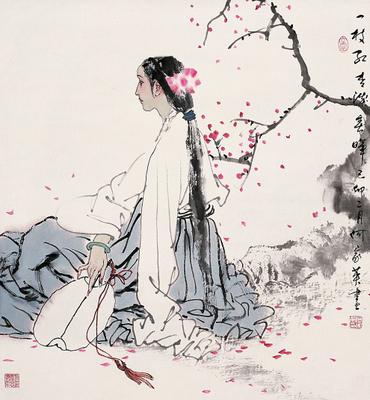 [译文] 她默默无语,望着这即将逝去的春天,满腹愁情全都显露在微蹙的双眉之间。 [出自] 北宋 周邦彦 《诉衷情·出林杏子落金盘》 出林杏子落金盘。齿软怕尝酸。可惜半残青紫,犹印小唇丹。 南陌上,落花闲。雨斑斑。不言不语,一段伤春,都在眉间。 注释: 出林杏子:刚从杏林中摘下的杏子。 金盘:盘子的美称。 齿软:杏酸得牙齿发软,禁受不住。 唇丹:搽在唇上的丹红。 南陌:南城的街道。 落花闲:花瓣悠悠飘落。 译文1: 金盘里盛着刚摘下的杏子。少女品尝了一口,就酸得牙齿禁受不住了。青紫的酸杏,留下了一个小小的唇红印。 花儿像细雨一样悠悠飘落,地上一片斑斑点点的残红。少女望着落花,虽然不言不语,伤春的闲愁,都凝在蹙皱的双眉之间。 译文2: 杏子刚刚成熟,便摘下树梢,盛放在金盘里。美丽的姑娘拿起一颗,迫不及待地品尝,只觉得杏酸齿软,急忙放下,只留下一个小巧的红唇印在青紫色的杏子上。 她看见窗外的街道上,落花慢悠悠地飘落下来,如同洒下的雨点,班驳一片。她默默无语,望着这即将逝去的春天,满腹愁情全都显露在微蹙的双眉之间。 ![]() 赏析: 这是一首写少女伤春的词。少女伤春,在周邦彦以前的诗人词人中有不少人写过,但跟尝果怕酸联系起来,却是罕见的。周邦彦这首词由少女尝果写到伤春,过渡自然,联系紧凑。 “红杏枝头春意闹”,(宋祁《玉楼春》),可见杏子成熟,当在暮春时节了,新摘来的杏子放在金盘里,色泽鲜艳明丽,不用“置金盘”,而用“落金盘”,因“落”字有从摘下到放置过程的动态感,即摘下放入的意思,比“置”字生动得多。新出林的杏子特点是鲜脆,逗人喜爱。但又由于是新摘,没有完全熟透,味道是酸多甜少,颜色青紫而不太红。而少女好奇,好新鲜,见到鲜果以先尝为快。但乍尝之后,便觉味酸而齿软了。正如韦应物诗“试摘犹酸亦未黄。”少女怕酸,不敢再吃,只剩下大半个吃剩的杏子。青紫色的残杏,留下少女一道小小的口红痕迹,唇丹与青紫相间,在词人看来,简直是一种美的享受。而这位少女也必然因怕酸而攒眉蹙额,娇态可掬,更惹人怜爱了。所以词人用了“可惜”二字,而不用“留得”二字。因为这不只是在写半枚残杏,而是透过残杏写少女。 下片先从少女眼里写周围环境,南陌上,满地落花狼藉,春雨斑斑,送走了春天。真是春雨无情,落花有恨。这三句似与上下文无关系。但看最后三句之后,便可体会到这三句环境描写对少女的伤春情怀起了烘托作用。正是在这样一个落花春雨的撩乱氛围中,才使少女感到“落花风雨更伤春。”(晏殊《浣溪沙》)而伤春心事“都在眉间”。也就是说因伤春而愁眉深锁。对于妙龄少女来说,伤春每由怀春引起。对花落春归,感岁月如流,年华逝水,因而有了某种爱情意识的跃动,这是可以理解的。但这却是少女不可透露的内心世界的秘密,所以她只能不言不语,终日攒眉。 上片说的少女因尝杏怕酸而攒眉,这是生活中的偶然现象,少女因怀春伤春而攒眉,则是生活中的必然现象。这两种现象在词中来了个巧合,少女以尝杏怕酸而攒眉,巧妙地掩饰了她因怀春而攒眉,掩饰了她内心的秘密,可谓妙合无垠,这也正是作者构思细密,匠心独运之处。 这首词上下两片初看似无关系,不易衔接,实则用暗线贯串,自然过渡,结构曲折。作者又善于抒写女性心理,将女性心理活动与景物描摹巧妙结合,所以后来评论周词的都很称赞他的词法,如清陈世焜云:“词至美成,开合动荡,包扫一切。”(《云韶集》卷四)