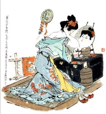 韩偓 百舌唤朝眠,春心动几般。 枕痕霞黯淡,泪粉玉阑珊。 笼绣香烟歇,屏山烛焰残。 暧嫌罗袜窄,瘦觉锦衣宽。 昨夜三更雨,今朝一阵寒。 海棠花在否,侧卧卷帘看。 ![]() 赏析: 《懒起》是一首能反映韩偓“香奁体”特色的一首五言律诗。诗中以细致入微的艺术笔触,悉心刻划了一位思春少妇从内心到外表的情态特征,造成了一种慵懒而优雅、无奈而情痴的多重审美效果同。命题“懒起”,应是人去屋空、为谁而容的困境所致。 第一联 开篇见意,写出百鸟齐鸣的盎然生机,进而点明它在人心中所激起的反应。“动几般”,是个有层次感的描写,指的是春之声如一股股春潮,激荡着思春、知春的人们。而“春心”一语双关,既是指自然之春意,又是指诗中女主人面对春情。 第二联 作者干脆利落地推出诗中主人公的面部特写:由于伏枕而眠,前一天晚妆之霞彩已为枕痕所暗淡,而梦中泪下,又不知不觉把傅粉之面流刷成憔悴之状。这里,“泪”字点出这位少妇的思妇身份。“阑珊”是点出少妇所以懒起、所以惜春,皆缘于深感年与时驰、意与日去,长守空楼之故。这后一句诗,含蓄地透露了昨夜情事,使人依稀感觉到那一夜春梦,不禁生出对诗中主人公的关怀和同情,从而自然悬念:她何事伤悲,为谁垂泪? 第三联 现出室内背景。纱绣笼罩的香炉里,袅袅之烟早已熄灭,绘有山形的画屏之后,尚可见一线残烛之光。这二句,写出了室内冷寂而又寥落的环境,为女主人眼中所见,是她心境的客观写照。其中,“烛焰残”三字,喻示昨夜斯人愁极而倦、朦胧睡去以至未及灭烛的情状,为诗词中写愁怨者常用手法。需要指出的是,这梦醒后女主人公的第一眼室内所见,与头二句对室外“百舌”的所闻,形成强烈反差,进而引起情绪由幻入真、由梦入醒的大跌宕,颇有深味。 第四联 由写物复转写人,由中景移及近景,由面部描写变为体态描绘。至此,女主人公的慵懒全貌尽入眼底。这一描写非单纯、静止的,而是依生活的节奏和秩序,自下而上推进:女主人公开始懒洋洋地穿戴起来。然而,春天无名的躁动却使她今天怎么也自在不起来:一夜的辗转难眠,使她心烦意乱,套上丝袜,顿觉太紧太窄;再看看自己为伊消瘦的玉体,又觉得套上的锦绣衣衫太大太肥,这一切都是由“春心动几般”一夜思念引起的。这一联是体态描写,更是心态描绘,从中所见女主人公内心的燥恼,正丰富了她的性格内涵,使之更形象、生动。 第五联 看似平常,在诗中颇有深意:昨夜三更听雨,正泄露她深夜难眠、心事重重,此处点出,是回忆使然。而“一阵寒”所透露,正是她经长时间失眠后临明时朦胧睡去、衣枕零乱,以至被早寒冻醒,意韵深厚,留给人悠长的想象空间。此后,宋人陆放翁有“小楼一夜听春雨,深巷明朝卖杏花”的佳句,发挥得更有韵味。 末联 由回忆昨夜三更雨,而念及昨夜听雨时的隐忧:院中那株盛开而可喜的海棠花还安然无恙吗?于是,她慵懒地斜倚在床,挑起帘子一角向外望去。值得注意的是,她关注海棠的命运,可又不愿挪步户外去看个究竟,而是以侧卧的慵懒之姿潦草观察,为什么呢?其“懒”当有深层的心理背景,也就是,她深知那带来“今朝一阵寒”的三更雨的摧残力,已对海棠花的存在不抱多少希望。喻示着她面对无情命运的无奈与无聊。李清照化用此诗为《如梦令》遂成千古绝唱:“昨夜雨疏风骤,浓睡不消残酒。试问卷帘人,却道海棠依旧。知否?知否?应是绿肥红瘦。”惜春之心,千古一也。