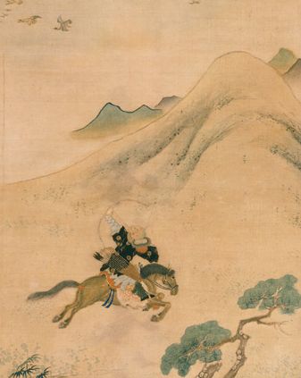 张祜 晓出郡城东,分围浅草中。 红旗开向日,白马骤迎风。 背手抽金镞,翻身控角弓。 万人齐指处,一雁落寒空。 注释 ⑴李司空:未详何人,疑指李愿或李愬。猎:打猎。 ⑵郡城:郡治所在地。此指徐州城。 ⑶红旗:古代用作军旗或用于仪仗队的红色旗。 ⑷金镞:金属制成的箭头。这里指箭。唐皮日休《馆娃宫怀古》诗:“弩台雨坏逢金镞,香径泥销露玉钗。” ⑸角弓:以兽角为饰的良弓。《诗经·小雅·角弓》:“驳骍角弓,翩其反矣。”朱熹集传:“角弓,以角饰弓也。”[2] [3] 译文 早上人马出奔郡城以东,众人分守围猎浅草丛中。 红旗招展向着初升太阳,白马奔驰迎着烈烈劲风。 反手先从背后抽出金箭,翻身再满满地拉开角弓。 众人喝彩共同所指之处,一只大雁坠落十里高空。 万人齐指处,一雁落寒空。 这两句是说,李司空在作射箭表演,围观的人群,突然爆发出一阵吹呼,并且一齐指向遥远的空中,原来在那秋日的蓝天高处,一只带箭的鸿雁,直向地面坠落下来,司空一箭高高命中。取材精确,描写明快,以刹那间雁落寒空的独特镜头,使之迸发出异彩。 创作背景 李愿和李愬都曾出镇徐州。其中李愿于长庆元年(821年)为检校司空。此诗可能就作于这段时间前后。 ![]() 赏析 《观徐州李司空猎》是唐代诗人张祜创作的一首五律。此诗主要写李司空打猎的过程以及众人观猎的情貌,塑造了一个武艺高超的英勇骑士形象。诗先叙事,铺写背景。前二联描写旭日东升、晨风方起、红旗猎猎、骏马奔驰,铺开了一幅围猎的宏大场景,为主人公出场做好铺垫。接着写英雄人物亮相出场。颈联正面描写这位骁勇猎手当众显露猎射飞雁,表现其矫健灵活的杰出身手。尾联通过随从和观猎者的反应,从侧面突出了主人公的射艺超群。全诗取材精确,剪裁得当,写得干净利落。 此诗的起联两句叙事:“晓出禁城”,点明围猎时间;“分围浅草”,写出壮阔场面。两句为全诗铺写了一个背景,画面开朗,色彩鲜丽。 颔联“红旗开向日,白马骤迎风”中的“红旗向日”,色彩耀目;“白马迎风”,气宇轩昂。 总括诗的前半部分,一至三句,是以朝霞满天,晨风拂煦,绿草如茵,红旗向日,作为人物亮相之前的壮丽场景,紧接而来的“白马骤迎风”一句,是英雄人物跃马出场,施展浑身“帅”劲的亮相动作。由此而下,此诗便将写作重心转到这位骁勇骑士当众显露猎射飞雁,矫健灵活的杰出身手上去。 “背手抽金镞”,是正面描写骑士背手取箭的动作,著一“抽”字,手势的利落可知,加之“背手”而“抽”,又可见身段之灵巧。“翻身控角弓”,弯弓名之曰“控”,这就进一步展现了射者臂力强劲的架势,“控”之而再来一个“鹞子翻身”的漂亮动作,造型健美。 对于这位英雄射手的真正的评价,当然不是停留在一招一式的动作表面。关键所在,毕竟还有待于亮出他那百步穿杨的惊人绝技。果然,刹那之间,就在围观的人群中间,突然爆发出一阵哄然的欢呼,并且一齐指向遥远的天空。原来蓝天高处,一只带箭的鸿雁,垂着双翅,直向地面坠落下来。东坡词云:“高处不胜寒。”(《水调歌头·明月几时有》)此处“寒空”之“寒”,虽有点出时令的作用,但主要在渲染高飞鸿雁的凌绝苍穹,从而加强了一箭高高命中的神异气氛。 全诗至此,戛然而止。由于射雁成功而出现的欢声雷动的热烈场面,自可留给读者去想象了。 此诗在取材方面,干净利索地只写场面中的一个人物,而且又只写此一马上英雄的一个手势与一个身段,并以刹那之间雁落寒空的独特镜头使之迸发异彩,取材之精确,描写线条之明快,确乎令人随同“万人齐指”而为之欢呼叫绝。