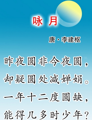 李建枢 昨夜圆非今夜圆,却疑圆处减婵娟。 一年十二度圆缺,能得几多时少年。 注 ①李建枢:唐代诗人。 ②咏:描述。 ③婵娟:非常美好的姿态 。 ④度:次,回。 ![]() 赏析 这是一首“咏月"的小诗。昨天的圆月不是今天的圆月,真怀疑这再圆的月亮是否依旧美丽, 在一年十二个月里,月亮圆了又缺,缺了又能再圆,可一个人的一生当中,属于青春年少的光阴又能有多少呢? 诗人通过对自然交替的变化,领悟到光阴的无情,岁月短暂的道理,告诫人们要珍惜时光。