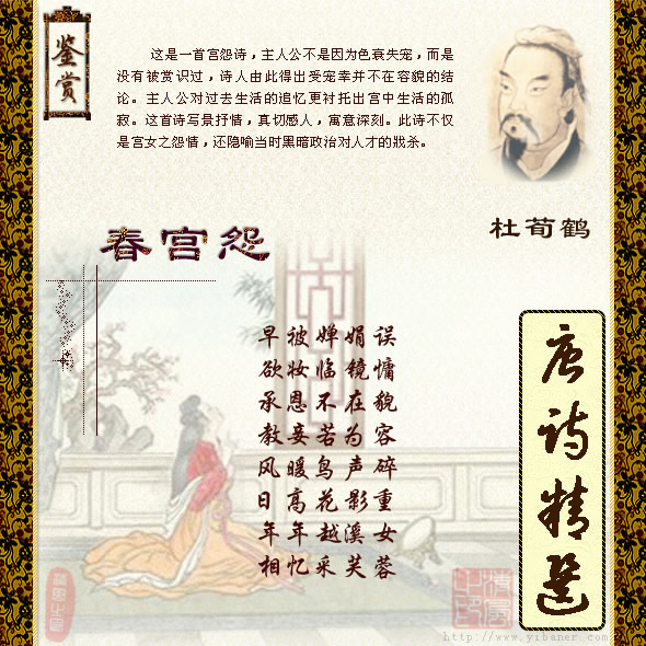 春宫怨 杜荀鹤 早被婵娟误,欲妆临镜慵, 承恩不在貌,教妾若为容? 风暖鸟声碎,日高花影重。 年年越溪女,相忆采芙蓉。 ![]() 【诗文解释】 早年被美丽的容貌所贻误,想要梳妆,对着镜子又懒散了。承受皇帝的宠爱不在容貌,叫我如何修饰面容?春风和暖,鸟声悦耳,阳光高照,花影重叠。年年想起越溪浣纱的女伴,回忆一起采芙蓉的情景。 【词语解释】 婵娟:形态美好。 慵:懒。 承恩:承受宠欢。 教:使。 碎:繁碎。 ![]() 【诗文赏析】 《春宫怨》是唐末诗人杜荀鹤创作的代宫女抒怨的代言诗。此诗含有自叹无人赏识之意。首联写因貌美而入宫,受尽孤寂,不愿梳妆,颔联写取宠不在容貌,因而不必妆扮了。颈联写景,春风骀荡,风和日丽,鸟语花香,借以烘托春心受残,寂寞空虚的情感。末联写往日之悲苦,更露其怨情。“风暖鸟声碎,日高花影重”是历来为人所推崇的名句。 这是一首宫怨诗,主人公不是因为色衰失宠,而是没有被赏识过,诗人由此得出受宠幸并不在容貌的结论。主人公对过去生活的追忆更衬托出宫中生活的孤寂。这首诗写景抒情,真切感人,寓意深刻。此诗不仅是宫女之怨情,还隐喻当时黑暗政治对人才的戕杀。 历来写宫怨的诗大多不着“春”字,即使是写春宫之怨的,也没有一首能象杜荀鹤这首那样传神地把“春”与“宫怨”密合无间地表现出来。 前两句是发端。“婵娟”,是说容貌美好。宫女之被选入宫,就因为长得好看,入宫以后,伴着她的却只是孤苦寂寞,因而拈出一个“误”字,慨叹“今日在长门,从来不如丑”(于濆《宫怨》)。此刻,她正对着铜镜,顾影自怜,本想梳妆打扮一番,但一想到美貌误人,又不免迟疑起来,懒得动手了。上句一个“早”字,仿佛是从心灵深处发出的一声深长的叹息,说明自己被误之久;次句用欲妆又罢的举动展示怨情也很细腻。这两句在平淡之中自有自然、深婉的情致。 三、四句用的是流水对,上下句文意相续,如流水直泻,一气贯注,进一步写出了欲妆又罢的思想活动。“若为容”是“怎样打扮”的意思,这里实际上是说打扮没有用。既然被皇上看中并不在于容貌的美好,那么,我再打扮又有什么用呢?言外之意,起决定作用的是别的方面,例如勾心斗角、献媚邀宠等。 五、六句忽然荡开,诗笔从镜前宫女一下子转到室外春景:春风骀荡,鸟声轻碎,丽日高照,花影层叠。这两句写景,似乎与前面描写宫女的笔墨不相连属,事实上,仍然是围绕着宫女的所感(“风暖”)、所闻(“鸟声”)与所见(“花影”)来写的。在欲妆又罢的一刻,透过帘栊,暖风送来了动听的鸟声,游目窗外,见到了“日高花影重”的景象。临镜的宫女怨苦之极,无意中又发现了自然界的春天,更唤起了她心中无春的寂寞空虚之感。景中之情与前面所抒写的感情是一脉相承的。 “风暖”这一联设色浓艳,《诗人玉屑》(卷三)把它归入“绮丽”一格。风是“暖”的;鸟声是“碎”的──所谓“碎”,是说轻而多,唧喳不已,洋溢着生命力,刚好与死寂的境界相对立;“日高”,见出阳光的明丽;“花影重”,可以想见花开的繁茂。绮丽而妙,既写出了盛春正午的典型景象,反衬了怨情,又承上启下,由此引出了新的联想。 眼前声音、光亮、色彩交错融合的景象,使宫女想起了入宫以前每年在家乡溪水边采莲的欢乐情景:荷叶、罗裙,一色裁成,芙蓉似脸,脸似芙蓉,三人一队,五人一群,溪声潺潺,笑语连连……“越溪”即若耶溪,在浙江绍兴,是当年西施浣纱的地方,这里借指宫女的家乡。这两句以过去对比现在,以往日的欢乐反衬出今日的愁苦,使含而不露的怨情具有更为悠远的神韵。诗的后四句虽是客观的写景与叙事,然而揭开字句的帷幕,却可以听到宫女隐微而又极其伤痛的啜泣之声。 从诗的意境来看,《春宫怨》似不只是诗人在代宫女寄怨写恨,同时也是诗人的自况。人臣之得宠主要不是凭仗才学,这与宫女“承恩不在貌”如出一辙;宫禁斗争的复杂与仕途的凶险,又不免使人憧憬起民间自由自在的生活,这与宫女羡慕越溪女天真无邪的生活又并无二致。它不仅是宫女之怨情,还隐喻当时黑暗政治对人才的戕杀。 这首诗以“风暖”一联饮誉诗坛,就全篇而论,无疑也是一首意境浑成的好诗。(陈志明)