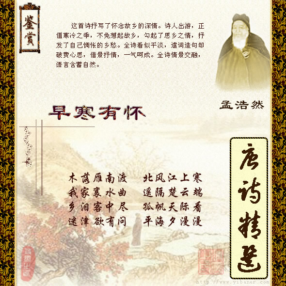 《早寒江上有怀》 孟浩然 木落雁南渡,北风江上寒。 我家襄水曲,遥隔楚云端。 乡泪客中尽,孤帆天际看。 迷津欲有问,平海夕漫漫。 注释 ⑴木落:树木的叶子落下来。雁南渡:大雁南飞。南:一作“初”。 ⑵首二句从鲍照《登黄鹤矶》“木落江渡寒,雁还风送秋”句脱化而来。 ⑶襄(xiāng)水曲(qū):在汉水的转弯处。襄水,汉水流经襄阳(今属湖北)境内的一段。曲,江水曲折转弯处,即河湾。襄:一作“湘”,又作“江”。曲:一作“上”。 ⑷楚云端:长江中游一带云的尽头。云:一作“山”。 ⑸乡泪客中尽:思乡眼泪已流尽,客旅生活无比辛酸。 ⑹孤:译作“归”。天际:天边。一作“天外”。 ⑺迷津:迷失道路。津,渡口。 ⑻平海:长江下游入海口附近江面宽阔,水势浩大,称为“平海”。 (9)《论语 微子》记载,孔子曾经在旅途中迷失方向,让子路向正在耕种的隐士长沮、桀溺询问渡口(迷津)。这两句化用这个典故,表示自己落拓失意,前途渺茫之叹。[1-3] 译文(一) 树叶飘落,大雁飞向南方,北风萧瑟因而江上分外寒冷。家乡就在弯弯曲曲的襄水边,远隔楚云之端。思乡的眼泪已流尽,客旅的生活无比辛酸,看归来的帆在天边徜徉。风烟迷失了去渡口的道路,茫茫江水在夕阳下荡漾。 译文(二) 草木枯黄凋零了,阵阵鸿雁飞向南, 北风呼啸刮不停,一江秋水一江寒。 家乡是那鹿行山,茅庐就在襄水湾, 遥望远方的楚地,楚地茫茫在云端。 思乡眼泪已流尽,客旅生活多辛酸, 孤帆远方在天际,此情此景不堪看。 在想找人问一问,迷路渡口在哪边。 暮色苍茫无所见,只见江海水漫漫。 乡泪客中尽,孤帆天际看。 这两句写思乡之情——满心思乡的泪水,在作客生涯中流尽了;想念家乡而一时又回不到家,只能于孤舟中遥望天边之故乡。诗句不仅点明了乡思,而且把这种感情一泄无余。“乡泪”是情,“归帆”是景,以情对景,自然成对,充分表达了诗人的感情。 【评析】: 这是一首怀乡思归的抒情诗。以兴开首,借鸿雁南飞,引起客居思归之情。中间写望见孤帆远去,想到自己无法偕同的怅惘,最后写欲归不得的郁积。 全诗情感是复杂的。诗人既羡慕田园生活,有意归隐,但又想求官做事,以展鸿图。这种矛盾,就构成了诗的内容。 ![]() 创作背景 孟浩然曾于公元727年(唐玄宗开元十五年)到长江下游漫游过一次,公元729年(开元十七年)至733年(开元二十一年)孟浩然再到吴越漫游。这首诗当作于漫游长江下游时期的一个秋天。[2-3] 因离乡日久,触景生情,诗人便在诗中表达了对家乡的思念,并抒发了心境的迷茫之情。写景自然典型,抒情真切深入,可以称之为“情因景生,情景交融”。[6] 鉴赏: 这是一首怀乡思归的抒情诗。全诗情感是复杂的。诗人既羡慕田园生活,有意归隐,但又想求官做事,以展鸿图。这种矛盾,就构成了诗的内容。 “木落雁南度,北风江上寒”,这两句是写景。作者捕捉了当时带有典型性的事物,点明季节。木叶渐脱,北雁南飞,这是最具代表性的秋季景象。但是单说秋,还不能表现出“寒”,作者又以“北风”呼啸来渲染,使人觉得寒冷,这就点出了题目中的“早寒”。 落木萧萧,鸿雁南翔,北风呼啸,天气寒冷,作者活画出一幅深秋景象。处身于这种环境中,很容易引起悲哀的情绪,所谓“悲落叶于劲秋”(陆机《文赋》),是有一定道理的。远离故土,思想处于矛盾之中的作者就更是如此了。 这是一种“兴”起的手法,诗很自然地进入第二联。孟浩然面对眼前景物,思乡之情,不免油然而生。“襄水”,亦即“襄河”。汉水在襄阳一带水流曲折,所以孟浩然以“曲”概括之。“遥隔”两字,不仅表明了远,而且表明了两地隔绝,不能归去。这个“隔”字,已透露出思乡之情。作者家住襄阳,古属楚国,故诗中称“楚云端”,既能表现出地势之高(与长江下游相比),又能表现出仰望之情,可望而不可即,也能透露出思乡的情绪。“我家襄水曲,遥隔楚云端”,看来句意平淡,但细细咀嚼,是很能体味到作者炼句之妙、造意之苦的。 如果说第二联只是透露一些思乡的消息,带有含蓄的意味,而又未点明;那么第三联的“乡泪客中尽”,不仅点明了乡思,而且把这种感情一泄无余了。不仅他自己这样思乡,而且家人也在想望着他自己的归去,遥望着“天际”的“孤帆”。家人的想望,是假托之词,然而使思乡的感情,抒发得更为强烈了。“迷津欲有问”,是用《论语·微子》孔子使子路问津的典故。长沮、桀溺是隐者,而孔子则是积极想从政的人。长沮、桀溺不说津(渡口)的所在,反而嘲讽孔子栖栖遑遑、奔走四方,以求见用,引出了孔子的一番慨叹。双方是隐居与从政的冲突。而孟浩然本为襄阳隐士,如今却奔走于东南各地(最后还到长安应进士举),却是把隐居与从政的矛盾集于一身,而这种矛盾又无法解决,故以“平海夕漫漫”作结。滔滔江水,与海相平,漫漫无边,加以天色阴暗,已至黄昏。这种景色,完全烘托出作者迷茫的心情。 这首诗二、三两联都是自然成对,毫无斧凿痕迹。第二联两句都是指襄阳的地位,信手拈来,就地成对,极为自然。第三联“乡泪”是情,“归帆”是景,以情对景,扣合自然,充分表达了作者的感情。最后又以景作结,把思归的哀情和前路茫茫的愁绪都寄寓在这迷茫的黄昏江景中了。 鉴赏二: 诗的开头两句,扣诗题“早寒江上”。“木落雁南度”是眼中所见“早寒”景象,“北风江上寒”更多地着眼于