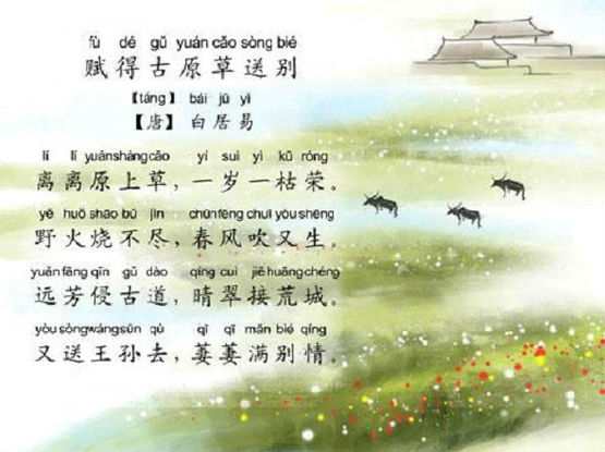 “远芳侵古道,晴翠接荒城。” “远芳”,指远处的野草.“侵”是蔓延的意思.“晴翠”指的是阳光照在草地上,反射出一片翠绿的颜色.这两句的意思是说,晴空下,翠绿的野草连成一片,淹没古道,伸向远方,连接着荒凉的古城. 【出自】 白居易 《赋得古原草送别》 赋得古原草送别 (唐)白居易 离离原上草,一岁一枯荣。 野火烧不尽,春风吹又生。 远芳侵古道,晴翠接荒城。 又送王孙去,萋萋满别情。 注释 赋得:借古人诗句或成语命题作诗。诗题前一般都冠以“赋得”二字。这是古代人学习作诗或文人聚会分题作诗或科举考试时命题作诗的一种方式,称为"赋得体"。 离离:青草茂盛的样子。 一岁一枯荣:枯,枯萎。荣,茂盛。野草每年都会茂盛一次,枯萎一次。 远芳侵古道:芳,指野草那浓郁的香气。远芳:草香远播。侵,侵占,长满。远处芬芳的野草一直长到古老的驿道上。 晴翠:草原明丽翠绿。 王孙:本指贵族后代,此指远方的友人。 萋萋:形容草木长得茂盛的样子。[5] [6] 译文 长长的原上草是多么茂盛,每年秋冬枯黄春来草色浓。无情的野火只能烧掉干叶,春风吹来大地又是绿茸茸。 野草野花蔓延着淹没古道,艳阳下草地尽头是你征程。我又一次送走知心的好友,茂密的青草代表我的深情。 译文2: 野草啊,铺满了高原, 一年一度,你的生命在荣枯中绵延。 野火不能把你烧死, 春风里,又是生机盎然。 你花的芳香弥漫在遥远的古道, 你叶的碧绿衬托着荒城的蓝天。 啊,就沿着这古道游子去了, 葱郁的草色突然变得黯然。 译文3: 古原上的野草繁密茂盛,每年一度枯萎一度繁荣。任凭野火焚烧也烧不尽,春风吹来又蓬勃地滋生。远处的芳草侵伸向古道,翠绿的草色连接着荒城。在此又送他乡游子远去,萋萋的芳草也充满别情。 ![]() 赏析: 《赋得古原草送别》是唐代诗人白居易的成名作。此诗通过对古原上野草的描绘,抒发送别友人时的依依惜别之情。它可以看成是一曲野草颂,进而是生命的颂歌。诗的前四句侧重表现野草生命的历时之美,后四句侧重表现其共时之美。全诗章法谨严,用语自然流畅,对仗工整,写景抒情水乳交融,意境浑成,是“赋得体”中的绝唱。人教版小学课本中的古诗《草》选取的是该诗前四小句。 此诗作于贞元三年(787),作者时年十六。诗是应考的习作。按科场考试规矩,凡指定、限定的诗题,题目前须加“赋得”二字,作法与咏物相类,须缴清题意,起承转合要分明,对仗要精工,全篇要空灵浑成,方称得体。束缚如此之严,故此体向少佳作。据载,作者这年始自江南入京,谒名士顾况时投献的诗文中即有此作。起初,顾况看着这年轻士子说:“米价方贵,居亦弗易。”虽是拿居易的名字打趣,却也有言外之意,说京城不好混饭吃。及读至“野火烧不尽”二句,不禁大为嗟赏,道:“道得个语,居亦易矣。”并广为延誉。(见唐张固《幽闲鼓吹》)可见此诗在当时就为人称道。 咏物诗也可作为寓言诗看。有人认为是讥刺小人的。从全诗看,原上草虽有所指,但喻意并无确定。“野火烧不尽,春风吹又生,”却作为一种“韧劲”而有口皆碑,成为传之千古的绝唱。 “远芳侵古道,晴翠接荒城”极言春草的茂盛、原野的阔远及春日的和煦。“古道”、“荒城”紧扣题中“古原”,用人事的代谢与自然界的光景常新作对照,以“侵”、“接”二字刻画春草蔓延、绿野广阔的景象,传神写照,可谓善于体物。末句卤草关合人事,远送王孙。王孙借指作者韵朋友。用春草之繁茂借喻别离之情的传统,由来已久。 ![]() 赏析二: 《赋得古原草送别》即是通过对古原上野草的描绘,抒发送别友人时的依依惜别之情。 诗的首句“离离原上草”,紧紧扣住题目“古原草”三字,并用叠字“离离”描写原上草的顽强生存坏境。第二句“一岁一枯荣”,进而写出原上野草秋枯春荣,岁岁循环,生生不已的规律。第三、四句“野火烧不尽,春风吹又生”,一句写“枯”,一句写“荣”,是“枯荣”二字意思的发挥。不管烈火怎样无情地焚烧,只要春风一吹,又是遍地青青的野草,极为形象生动地表现了原上草顽强的生命力。第五、六句“远芳侵古道,晴翠接荒城”,用“侵”和“接”刻画春草蔓延,绿野广阔的景象,“古道”“荒城”又点出友人即将经历的处所。最后两句“又送王孙去,萋萋满别情”,点明送别的本意。用绵绵不尽的萋萋春草比喻充塞胸臆、弥漫原野的惜别之情,真正达到了情景交融,韵味无穷。 全诗章法谨严,用语自然流畅而又工整,写景抒情水乳交融,意境浑成,在“赋得体”中堪称绝唱。 据宋人尤袤《全唐诗话》记载:白居易十六岁时从江南到长安,带了诗文谒见当时的大名士顾况。顾况看了名字,开玩笑说:“长安米贵,居大不易。”但当翻开诗卷,读到这首诗中“野火烧不尽,春风吹又生”两句时,不禁连声赞赏说:“有才如此,居亦何难!”连诗坛老前辈也被折服了,可见此诗艺术造诣之高。