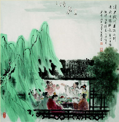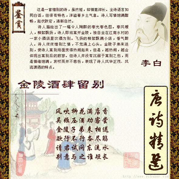 请君试问东流水,别意与之谁短长? [译文] 请你试着问问东流的长江水,我们离别的情意和它相比,哪一个短哪一个长? [出自] 李白 《金陵酒肆留别》 风吹柳花满店香,吴姬压酒劝客尝。 金陵子弟来相送,欲行不行各尽觞。 请君试问东流水,别意与之谁短长? ![]() 注释: 金陵:今江苏省南京市。 酒肆:酒店。 留别:临别留诗给送行者。 吴姬:吴地的青年女子,这里指酒店中的侍女。 压酒:压糟取酒。古时新酒酿熟,临饮时方压糟取用。 子弟:指李白的朋友。 欲行:要走的人,指李白自己。 不行:送行的人,指金陵子弟。 尽觞(shāng):喝尽杯中的酒。 君:指金陵子弟。 东流水:指在金陵北面向东奔流的长江。 别意:离别的情意。 之:指东流水。 译文1: 风吹柳絮满店都是香味,吴地的女子压好了酒请客人品尝。 金陵的年轻朋友们都来为我送行,送与被送的人都频频举杯尽觞。 请你们问问这东流的水,离情别意与它相比究竟谁短谁长? 译文2: 和风吹着柳花,酒店里透着清香,吴地酒家女捧出美酒,热情地劝客品尝。金陵的年轻人前来送我,我与大家尽情的举觞。请你们试问东去的流水,我们之间的离情别意与它相比,谁短谁长? 译文3: 春风里飘飞的柳絮扑入酒店送来阵阵花香,店中的侍女用新酿的美酒劝客人品尝。金陵的年轻朋友纷纷前来送别,主客各开怀畅饮喝个痛快尽兴。请问那东逝的长江水,离情别绪谁短谁长? ![]() 赏析: 李白在出蜀当年的秋天,往游金陵,也就是今江苏南京,大约逗留了大半年时间。726年(开元十四年)春,诗人赴扬州,临行之际,朋友在酒店为他饯行,李白留诗告别。 句解 风吹柳花满店香,吴姬压酒唤客尝 和风吹着柳絮,酒店里溢满芳香;吴姬捧出新压的美酒,劝客品尝。“柳花”,说明时当暮春。“金陵”,点明地属江南。这是柳烟迷蒙、春风沉醉的江南三月,诗人一走进店里,沁人心脾的香气就扑面而来。这一“香”字,把店内店外连成一片。金陵古属吴地,遂称当地女子为“吴姬”,这里指酒家女。她满面春风,一边压酒(即压酒糟取酒汁),一边笑语殷勤地招呼客人。置身其间,真是如沐春风,令人陶醉,让人迷恋。 这两句写出了浓浓的江南味道,虽然未明写店外,而店外“杂花生树,群莺乱飞”,杨柳含烟的芳菲世界,已依稀可见。此时,无论是诗人还是读者,视觉、嗅觉、听觉全都调动起来了。如钟惺所说:“不须多亦不须深,写得情出。”诗中的“唤”字,在一些版本中又作“劝”。 “柳花”,即柳絮,本来是没有香的,但一些诗人却闻到了,如传奇“莫唱踏阳春,令人离肠结。郎行久不归,柳自飘香雪。”故明人杨升庵说:“其实柳花亦有微香,诗人之言非诬也;柳花之香,非太白不能道;竹之香,非子美不能道。”其实,对“满店香”的理解完全不必拘泥于此,那当是春风吹来的花香,是泥土草木的清香,是美酒飘香,大概还有“心香”,所谓心清闻妙香。 金陵子弟来相送,欲行不行各尽觞 金陵的一群年轻人来到这里,为诗人送行。饯行的酒啊,你斟我敬,将要走的和不走的,个个干杯畅饮。也有人认为,这是说相送者殷勤劝酒,不忍遽别;告别者要走又不想走,无限留恋,故“欲行不行”。 李白此行是去扬州。他后来在《上安州裴长史书》说:“曩昔东游维扬,不逾一年,散金三十余万,有落魄公子,悉皆济之。此则白之轻财好施也。”李白性格豪爽,喜好交游,当时既年轻富有,又仗义疏财,朋友自是不少。在金陵时也当如此。一帮朋友喝酒,话别,少年刚肠,兴致盎然,没有伤别之意,这也很符合年轻人的特点。“尽觞”,意思是喝干杯中酒。“觞”,酒器。 请君试问东流水,别意与之谁短长? 金陵一行,诗人是快乐的。在这样一个美好的时节,一个让人留恋的地方,诗人却要走了。面对美丽的江南风物和朋友们的盛情挽留,诗人依依不舍,怎样才能表达自己的无限惜别之情呢?也许饯别的酒店正面对大江,诗人顺手一指,以水为喻:请你们问问那东流的江水,离情别意与它相比究竟谁短谁长?此句兼用拟人、比喻、对比、设问等手法,构思新颖奇特,借滔滔不绝的大江流水来倾吐自己的真挚感情,亲切而且深情,有强烈的感染力。 情感是抽象的,即使再深再浓,也看不见摸不着;而江水是形象的,给人的印象是绵绵不绝。但诗人不是简单的相喻,而是设问比较,迷迷茫茫地,似收而未收住,言有尽而意无穷,给人以想象的空间。采用这种表现手法,李白可能受到前人的启发,如谢朓就写过“大江流日夜,客心悲未央”,但李白写得更加生动自然。
