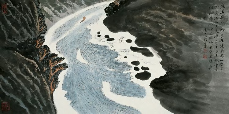 山随平野尽,江入大荒流。 [译文] 远处的山随着平原旷野的出现而逐渐消失,眼前的江水汹涌奔腾就像在涌入荒漠的原野。 [出自] 李白 《渡荆门送别》 渡远荆门外,来从楚国游。 山随平野尽,江入大荒流。 月下飞天镜,云生结海楼。 仍怜故乡水,万里送行舟。 ![]() 注释: 荆门:荆门山,在现在湖北宜都西北长江南岸,与北岸虎牙山对峙,形势险要。 楚国:楚地。 平野:平坦广阔的原野。 江:长江。 大荒:广阔无际的原野。 月下飞天镜:明月映入江水,如同飞下的天镜。下:移下。 海楼:海市蜃楼,这里形容江上云霞的美丽景象。 仍:频频。怜:爱。一本作“连”。故乡水:指从四川流来的长江水。因诗人从小生活在四川,把四川称作故乡。 万里:比喻行程之远。 大荒:广阔无际的田野。 译文1: 自荆门之外的西蜀沿江东下,我来到了楚地准备尽情漫游。 崇山随着荒野出现渐渐逝尽,长江进入了莽原也缓缓而流。 月影倒映江中像是飞来天镜,云层缔构成郭幻出海市蜃楼。 我依然怜爱这来自故乡之水,行程万里继续漂送我的行舟。 译文2: 我乘船从荆门以外的地方远道而来,为的是到古代楚国一带游览。高山随着平原的展现而隐去,大江进入无边无际的原野而汹涌奔流。明月倒映江中,像天外飞来一面明镜,江面上云彩变幻,在空中结成了奇妙的海市蜃楼。我仍然喜爱故乡的江水,万里迢迢伴随我泛舟远游。 译文3: 乘舟顺流而下,经过漫长的水路,来到荆门之外,来到这古老楚国的地面游览。山野已经到了尽头,宽阔平坦的原野进入我的眼帘。江水就在这大荒野地上奔流,浩浩漫漫。皎洁的明月在空中流转,如在空中的明镜。云气勃郁,由于阳光的折射,在大江面上变换莫测,如同海市蜃楼一般。虽然进入中原,我仍然依恋着故乡的水水山山。这些山水又是何等多情,不远万里,一直伴随着我这位游子的行舟。 山随平野尽,江入大荒流。 《渡荆门送别》作于唐玄宗开元十二年(公元724年)秋,时李白初出蜀沿江东下。这两句的意思是,连绵山岭随着平原的展现而不复再见;滔滔江水进入辽阔的旷野,一泄东流。状荆门平野山尽,江流壮阔之景,雄阔而豪爽,发自肺腑,自然流出,毫无斧凿之痕,为脍炙人口的名句,历来与杜甫的名句“星垂平野阔,月涌大江流”相提并论,相互媲美。王琦注中引丁龙友之评语说:“李是昼景,杜是夜景,李是行舟暂视,杜是停泊细观,未可概论。” 赏析: 诗人李白一生足迹几乎踏遍了祖国的名山大川,写了不少歌颂祖国壮丽河山的名诗佳篇。 公元725年,二十五岁的李白初次出蜀漫游,由水路乘船远行,经巴渝,出三峡,直向荆门山之外驶去,目的是到湖北、湖南一带楚国故地游览。 “渡远荆门外,来从楚国游”,指的就是这一壮游。这时候的青年诗人,兴致勃勃,坐在船上沿途纵情观赏巫山两岸高耸云霄的峻岭,一路看来,眼前景色逐渐变化,船过荆门一带,已是平原旷野,视域顿然开阔,别是一番景色。 “山随平野尽,江入大荒流。”前句形象地描绘了船出三峡、渡过荆门山后长江两岸的特有景色:山逐渐消失了,眼前是一望无际的低平的原野。它好比用电影镜头摄下的一组活动画面,给人以流动感与空间感,将静止的山岭摹状出活动的趋向来。“江入大荒流”,写出江水奔腾直泻的气势,从荆门往远处望去,仿佛流入荒漠辽远的原野,显得天空寥廓,境界高远。后句著一“入”字,力透纸背,用语贴切。景中蕴藏着诗人喜悦开朗的心情和青春的蓬勃朝气。 写完山势与流水,诗人又以移步换景手法,从不同角度描绘长江的近景与远景:“月下飞天镜,云生结海楼。”长江流过荆门以下,河道迂曲,流速减缓。晚上,江面平静时,俯视月亮在水中的倒影,好像天上飞来一面明镜似的;日间,仰望天空,云彩兴起,变幻无穷,结成了海市蜃楼般的奇景。 这正是从荆门一带广阔平原的高空中和平静的江面上所观赏到的奇妙美景。如在崇山峻岭的三峡中,自非亭午夜分,不见曦月,夏水襄陵,江面水流湍急汹涌,那就很难有机会看到“月下飞天镜”的水中影像;在隐天蔽日的三峡空间,也无从望见“云生结海楼”的奇景。这一联以水中月明如圆镜反衬江水的平静,以天上云彩构成海市蜃楼衬托江岸的辽阔,天空的高远,艺术效果十分强烈。颔颈两联,把生活在蜀中的人,初次出峡,见到广大平原时的新鲜感受极其真切地写了出来。 李白在欣赏荆门一带风光的时候,面对那流经故乡的滔滔江水,不禁起了思乡之情:“仍怜故乡水,万里送行舟。”江水流过的蜀地也就是曾经养育过他的故乡,而又初次离别的他不可能不无限留恋,依依难舍。但诗人不说自己思念故乡,而说故乡之水恋他。 这首诗写出作者浓浓的思乡之情,诗以浓重的怀念与惜别之情结尾,言有尽而情无穷。 这首诗是李白出蜀时所作。荆门,即荆门山,位于今湖北宜都县西北,长江南岸,与北岸虎牙山隔江对峙,形势险要,自古即有楚蜀咽喉之称。 “仍怜故乡水,万里送行舟。”诗人从“五岁诵六甲”起,直至二十五岁远渡荆门,一向在四川生活,读书于戴天山上,游览峨眉,隐居青城,对蜀中的山山水水怀有深挚的感情,江水流过的蜀地也就是曾经养育过他的故乡,初次离别,他怎能不无限留恋,依依难舍呢?但诗人不说自己思念故乡,而说故乡之水恋恋不舍地一路送我远行,怀着深情厚意,万里送行舟,从对面写来,越发显出自己思乡深情。诗以浓重的怀念惜别之情结尾,言