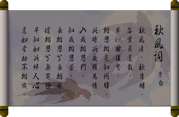相思相见知何日,此时此夜难为情。 [译文] 想当日彼此亲爱相聚,现在分开后何日再相聚,在这秋风秋月的夜里,想起来真是情何以堪。 [出自] 李白 《三五七言》 秋风清,秋月明, 落叶聚还散,寒鸦栖复惊, 相思相见知何日,此时此夜难为情。 入我相思门,知我相思苦, 长相思兮长相忆,短相思兮无穷极, 早知如此绊人心,还如当初不相识。 ![]() 译文: 秋天的风是如此的凄清,秋天的月是如此的明亮;落叶飘飘,聚了还离散,连栖息在树上的鸦雀都心惊。想当日彼此亲爱相聚,现在分开后何日再相聚,在这秋风秋月的夜里,想起来真是情何以堪。走入相思之门,知道相思之苦,永远的相思永远的回忆,短暂的相思却也无止境,早知相思是如此的在心中牵绊,不如当初就不要相识。 赏析: 李白秋风词〈三五七言〉:「秋风清,秋月明;落叶聚还散,寒鸦栖復惊。相思相见知何日,此时此夜难為情。」此诗描绘秋夜思人之情状,悱惻缠绵至极。 〈三五七言〉据说為诗仙李白独创,共六句叁十字,《李白集》和《全唐诗》皆收录之。所谓「三五七言」其实是「杂诗」的一种体裁。全诗兼用叁言、五言、七言。因全篇以三言、五言、七言相接,故题。这种打破一般唐诗齐言的长短句,可见李白诗才之超卓,屡屡突破成规、出人意表。 诗人藉物抒情,以落叶尚能聚散,寒鸦犹能飞栖,相较之下,人间之聚散离合令人心惻。思念伊人而相见无期,值此秋风秋月之时,诗人难以抑制自己的情感。「难為情」有情何以堪之意。 此诗看似思妇企盼良人归来的闺怨之作,其实亦或有李白对於己身不遇之感怀在内。「风清」、「月明」或可视為诗人所期盼的一种政治环境吧! 李白少年时期便「观其书」、「游神仙」、「好剑术」,才能、兴趣极為广泛。成年后,唐玄宗仅让李白待詔翰林,作為文学侍从之臣。性格傲岸不群的李白,自无法忍受如此「摧眉折腰事权贵」的生活。其后遭谗毁的李白离开长安,大多游山访仙,痛饮狂歌,以排遣怀才不遇之忧愤。虽然他始终并未放弃建功立业、成就非凡理想的抱负,但终其一生未能缔造人生高潮。是以,李白或如一般男性诗人假託女子闺怨,以抒发一己之不遇亦未可知。 然而,诗裡既有「风」又有「月」,「风月」二字连用往往暗喻男女情爱。风月自然无情,有情的只是风中月下之痴人而已。视之為情诗,恰如其份。 做為金庸小说「情书」之首的《神雕侠侣》即以咏风月始,第一回题為〈风月无情〉,引欧阳修其中一闕〈蝶恋花〉:「风月无情人暗换珥珥」;至第四十回〈华山之巔〉也以风月终。 话说「杨过珥珥携着小龙女之手,与神鵰并肩下山。其时明月在天,清风吹叶,树巔乌鸦呀啊而鸣,郭襄再也忍耐不住,泪珠夺眶而出。正是:『秋风清,秋月明;落叶聚还散,寒鸦栖復惊。相思相见知何日,此时此夜难為情。』」 金庸引用李白此诗,将郭襄的思慕之情表露无遗,足见「人生自是有情痴,此恨不关风与月」啊! 可见,「相思相见知何日,此时此夜难为情」两句,已直透痴男怨女的相思之情,可谓情之经典。