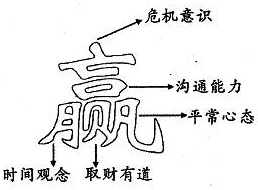 ![]() 参考答案 ①“赢”字由“亡”“口”“月”“贝”“凡”构成。(2分) ② “亡”表示危机意识,“口” 表示沟通能力,“月”表示时间概念,“贝”表示取财有道,“凡”表示平常心态。(2分) ③危机意识、沟通能力、平常心态、时间观念加上取财有道,是成为真正赢家的必备要素。(2分) |
