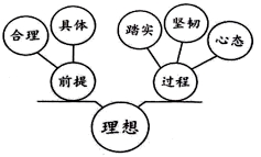 下面是关于实现理想的一个构思框架图,请把这个构思写成一段话,要求内容完整,表述准确,语言连贯,不超过60个字。(6分)