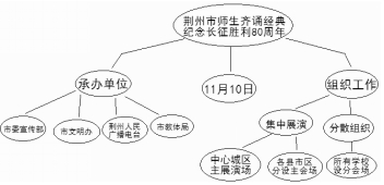 答:示例:荆州市师生齐诵经典纪念长征胜利80周年活动11月10日由市委宣传部、市文明办、荆州广播电台、市教体局承办,采取“集中展演,分散组织”的形式进行。中心城区设主展演场,县市区分设主会场,所有学校设分会场。 ![]() (内容完整,给2分;表述准确,给2分;语言连贯,给2分。如有其他答案,只要符合要求,可酌情给分;字数超出要求,酌情扣分。) |