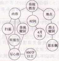 参考答案 示例:这次革命传统教育活动于4月5日在烈士陵园东侧进行。主要内容有祭扫烈士墓、聆听革命传 统报告和参观烈士陵园。活动结束后,要写出800字以上的心得体会。 (由题干和构思框架可以看出,该框架的陈述对象是革命传统教育,需要分三个类目五个层级依次说明。说明重点是教育内容。6分。内容完整3分,语言表达准确、连贯、得体3分。字数不合要求,酌情扣1~2分。)
