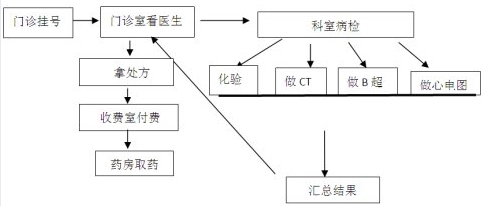 答:示例:门诊挂号后到门诊室看医生,按医嘱到不同科室化验并做CT、B超、心电图检查,然后把汇总的检查结果拿到门诊室交给医生,医生开出处方,患者携带处方到交费处支付药费后去药房领取药品。