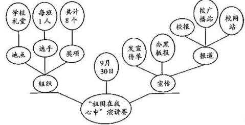 答: “祖国在我心中”演讲比赛拟于9月30日举行,组织工作需要布置学校礼堂,母班选拔1人参赛,最后评出8个奖项;宣传工作包括发宣传单、办黑板报以及在校报、校广播站和校网站进行报道。(内容完整3分,表述准确1分,语言连贯1分。如有其他答案,只要符合要求,可酌情给分;字数超过要求,酌情扣分)
