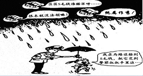 ①从孩子的角度的寓意:善行不分大小,行善从小做起。 ②从警察的角度的寓意:___________________ ③从喷口水者角度的寓意:_________________ 【答案参考】 从警察的角度立意:①要为孩子健康成长,撑起一片道德的天空。②要保护宝贵纯洁的童心,为善心撑起一把遮雨伞。 从喷口水者角度立意:①不要让善举淹没在口水中/不要让流言蜚语淹没高尚之举②愤世嫉俗者,可以休矣。③勿以小人之心度君子之腹。 (一点2分,两个角度各答对一点5分。其他寓意合乎情理即可给分)
