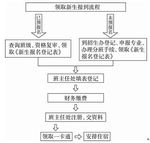 答:新生报到先领取新生报到流程,看是已预报名还是未预报名。已预报名学生先查询班级、进行资格复审、领取《新生报名登记表》,未预报名学生到招生办登记、申报专业、办理分班手续、领取《新生报名登记表》。然后都去班主任处填表登记,再到财务缴费,到班主任处注册、交资料,领取一卡通,最后安排住宿。