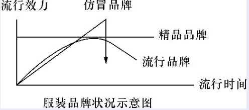 答:发展状况:“精品品牌”一进入市场就很受欢迎,并且平稳持续发展。(1分)“仿冒品牌”进入市场后流行效力很快上升,甚至超过了其他两类品牌,但流行一段时间后迅速被淘汰。(1分)“流行品牌”在发展前期呈上升趋势,达到高峰时可与“精品品牌”媲美,但一段时间后呈下降趋势。(2分)
