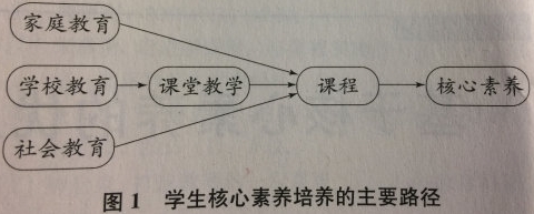答:培养学生核心素养必须通过课程来实现(1分),而课程的实施需要学校教育、家庭教育、社会教育形成合力(2分),当然主要由学校教育通过课堂教学来完成(2分)。(内容能扣住“路径图”文字表述即可,若表述语言不准确、不连贯酌情扣分。)