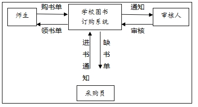 示例:整本书阅读购书平台依托学校图书订购系统(2分),师生、审核人、采购员均借此交互联系(2分):师生发出购书清单,系统通知审核人,经审核,采购员收到缺书单,返回进书通知后,系统向师生反馈领书单(2分)。