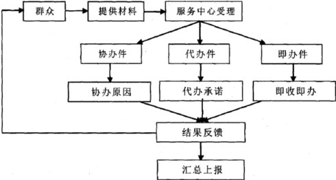 下面是某服务中心为方便群众办事而提供的流程图,请把这个图转写成一段文字介绍,要求内容完整,表述准确,语言连贯,不超过90个字。(6分)