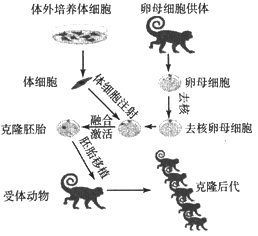 示例:首先从供体猴体内提取卵母细胞并去核,然后将体外培养的体细胞注射其中,使二者融合并将其激活,形成克隆胚胎,再将胚胎移植到受体猴体内,从而培育出克隆后代。