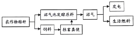 答:示例:农作物秸秆可以直接作为沼气池发酵原料生产沼气,也可以作为饲料饲养牲畜,把牲畜粪便作为原料牛产沼气,既可以用来发电,也可以当作牛活燃料。(内容完整给2分,表述准确给2分,语言连贯给2分,意思答对即可;超出字数要求酌情扣分。其他答案,符合题意、言之有理,亦可酌情给分。)