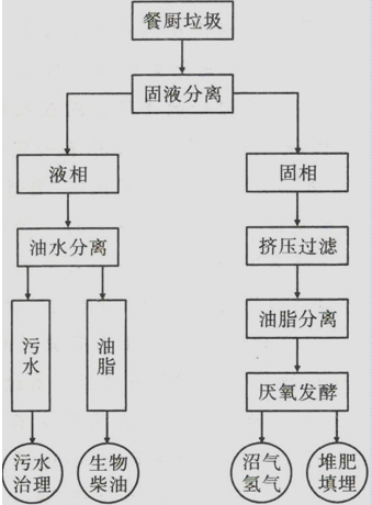 答:餐厨垃圾在经固液分离后,按固相和液相分别进行处理; (2分)液相部分进行油水分离,油脂可制成生物柴油,污水再进行污水治理;(2分)固相部分在经挤压过滤、油脂分离后,通过厌氧发酵阶段将产生的沼气用于制压缩天然气,沼渣用于生产有机肥。(2分)