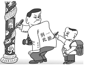 答:画面内容:漫画中一男子手拿一支笔,在景区石柱上写着“到此……”,他的儿子看见后,也拿出笔来在父亲的背上写下“到此一游”几个字。(3分)(意思对即可) (2)寓意:漫画批评了某些游客的不文明现象,同时告诫家长应以身作则,注重言传身教。(3分)