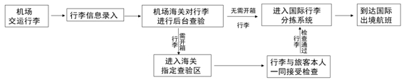 答:在蓝天机场托运行李出境时,旅客先在机场交运行李,机场录入行李信息。机场海关再对行李进行后台查验,无需开箱行李进入国际行李分拣系统,最后到达国际出境航班;需开箱行李,则进入海关指定查验区,旅客本人需同行李一同接受检查,检查通过行李进入国际行李分拣系统,最后到达国际出境航班。 【解析】本题考查图文转换的能力。首先抓住题干中关于此图的重要信息——“蓝天机场托运行李出境流程图”,方框里的词语属于重要信息,是流程中的关键环节,不能遗漏。其次既然是流程图,那么图中的箭头指向很关键,它指明了表述时的顺序,须按顺序表述。最后关注箭头上的文字,“需开箱的行李”和“无需开箱的行李”,需要分别叙述。