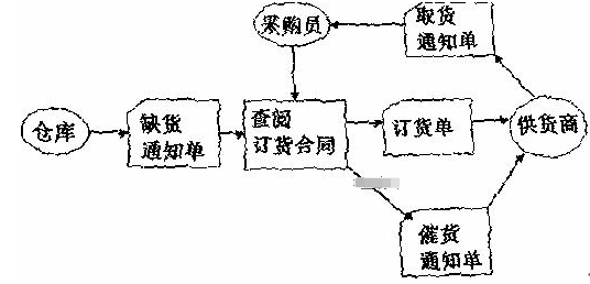 参考答案:某公司物资订货的业务流程:仓库提供缺货通知单,采购员发现缺货后,查阅订货合同,若已订货,向供货商发出催货通知单,否则,填写订货单交供货商。供货商发出货物后,立即向采购员发出取货通知单。