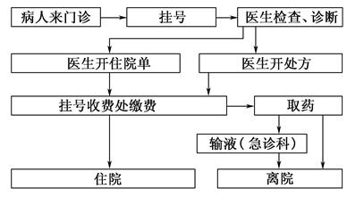 ![]() 病人在门诊挂号,经医生检查、诊断后,需要住院的,拿医生开的住院单去挂号收费处缴费住院;不需要住院的,拿医生开的处方去缴费取药后离院,如需输液,就到急诊科输液后离院。 【解析】本题考查将流程图转换为文字的能力。首先要明确叙述对象应是“病人”,表述时“病人”应是整个句子的主语;其次要条理清晰地表述出流程的变化。考生要特别注意“需要住院的”和“不需要住院的”的两条流程,不能混淆在一起表述,还要注意字数的限制。 |