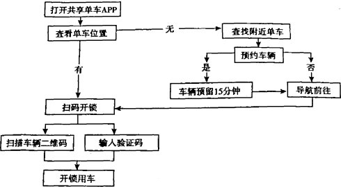 答:在手机上打开共享单车APP查看单车位置,附近有单车可直接扫描二维码或输入验证码开锁用车;(2分)如果附近没有车辆可点击查看附件车辆,需要预约则该单车可预留15分钟,不需要预约则直接导航前往,找到该车后扫码开锁。(4分)(信息不完整酌情扣分)