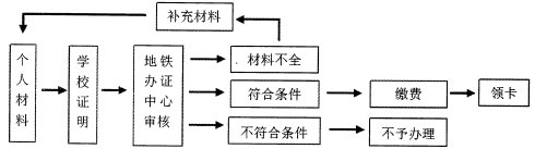 下面是某交通部门为中小学生办理地铁卡提供的流程图,请把此图转写成一段文字介绍,要求内容完整,表述准确,语言连贯,不超过80个字。(6分)