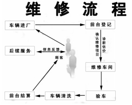 下面是某汽修厂维修流程图,请把这个图转写成一段文字介绍,要求内容完整,表述准确,语言连贯,不超过100个字。(6分)