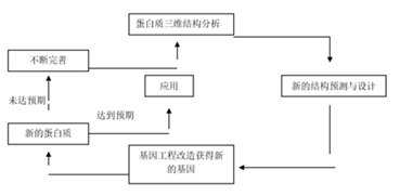 先进行蛋白质三维结构分析,经过新的结构预测与设计后,进行基因工程改造获得新的基因,产生新的蛋白质,如达到预期就进入应用,如未达预期,在不断完善后再次进行蛋白质三维结构分析。