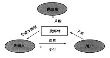 【答案示例】首先用户向爱鲜蜂公司下单。(2分)然后公司根据订单向供应商采购,采购结束后,爱鲜蜂公司向代理点提供仓储和供货服务。(2分)最后代理点给用户送货,用户向代理点支付货款。(2分)