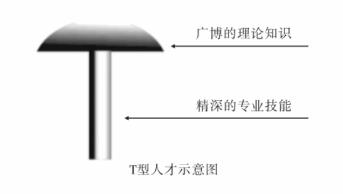 T型人才是一类集博与专于一身的新型人才。“T”表示其知识技能构成特点,“—”表示其横向的广博理论知识(或:表示其理论知识的广博面),“|”表示其纵向的精深专业技能(或:表示其专业技能的精深度)。