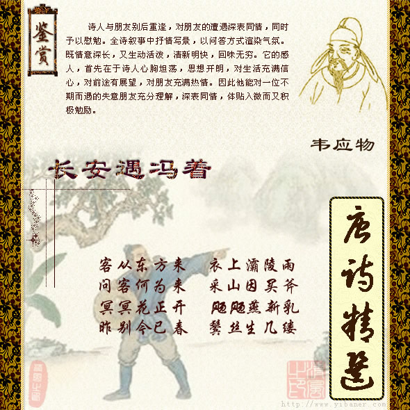 《长安遇冯著》 作者:韦应物 客从东方来,衣上灞陵雨。 问客何为来?采山因买斧。 冥冥花正开、扬扬燕新乳。 昨别今已春,鬓丝生几缕? 注解: 1、灞陵:即霸陵。 2、冥冥:形容雨貌。 3、燕新乳:意谓燕初生。 灞陵:即灞上,因汉文帝葬在这里,改名灞陵。 客:指中唐诗人冯著。 采山:指冯著有归隐山林之意。 冥冥:悄悄。 飏飏:飞翔的样子。 燕新乳:初生的小燕。 昨别:去年分别。 鬓丝:两鬓白发如丝。 翻译: 你从东方回到长安来, 衣裳沾满灞陵的春雨。 请问你来此为了何故? 你说为开山辟地买斧。 冥冥春雨百花淋雨开, 习习和风燕子新孵雏。 去年一别如今又逢春, 双鬓银丝添生了几缕? 二: 客人从东方过来,衣服上还带着灞陵的雨。问客人为什么来,客人说为了上山砍伐树木来买斧头。悄悄地百花正在盛开,飞翔的燕子正在哺乳小燕。去年一别如今又是春天,两鬓的头发不知又生出多少。 ![]() 创作背景 韦应物于大历四年至十三年在长安,而冯著在大历四年离长安赴广州,约在大历十二年再到长安。这诗可能作于大历四年或十二年。冯著是韦应物的朋友,其事失传,今存诗四首。韦应物赠冯著诗,也存四首。据韦诗所写,冯著是一位有才有德而失志不遇的名士。他先在家乡隐居,清贫守真,后来到长安谋仕,颇擅文名,但仕途失意。约在大历四年(769)应征赴幕到广州。十年过去,仍未获官职。后又来到长安。韦应物对这样一位朋友是深为同情的。 ![]() 赏析: 这首赠诗,以亲切诙谐的笔调,对失意沉沦的冯著深表理解、同情、体贴和慰勉。 开头写冯著从长安以东而来,一派名流兼隐士风度。接着以诙谐打趣形式劝导冯著对前途要有信心。再进一步劝导他要相信自己,正如春花乳燕焕发才华,会有人关切爱护的。最后勉励他昨日才分别,如今已经是春天了,你的鬓发并没有白几缕,还不算老呀!盛年未逾,大有可为。 全诗情意深长,生动活泼。它的感人之处,首先在于诗人的心胸坦荡,思想开朗,对生活充满信心,对前途充满希望,对朋友充满热情。因此,他能对一位邂逅的失意朋友,充分理解,真诚同情,体贴入微,而积极勉励。诗在叙事中写景,借写景以寄托寓意。情调和风格,犹如小河流水,清新明快,委曲宛转,读来一览无余,品尝则又回味不尽。 冯著是韦应物的朋友,其事失传,今存诗四首。韦应物赠冯著诗,也存四首。据韦诗所写,冯著是一位有才有德而失志不遇的名士。他先在家乡隐居,清贫守真,后来到长安谋仕,颇擅文名,但仕途失意。约在大历四年(769)应征赴幕到广州。十年过去,仍未获官职。后又来到长安。韦应物对这样一位朋友是深为同情的。 韦应物于大历四年至十三年在长安,而冯著在大历四年离长安赴广州,约在大历十二年再到长安。这诗可能作于大历四年或十二年。诗中以亲切而略含诙谐的笔调,对失意沉沦的冯著深表理解、同情、体贴和慰勉。它写得清新活泼,含蓄风趣,逗人喜爱。刘辰翁评此诗曰:“不能诗者,亦知是好。”确乎如此。 开头两句中,“客”即指冯著。灞陵,长安东郊山区,但这里并非实指,而是用事作比。汉代霸陵山是长安附近著名隐逸地。东汉逸士梁鸿曾隐于此,卖药的韩康也曾隐遁于此。本诗一二句主要是说冯著刚从长安以东的地方来,还是一派名士兼隐士的风度。 接着,诗人自为问答,料想冯著来长安的目的和境遇。“采山”是成语。左思《吴都赋》:“煮海为盐,采山铸钱。”谓入山采铜以铸钱。“买斧”化用《易经·旅卦》:“旅于处,得其资斧,我心不快。”意谓旅居此处作客,但不获平坦之地,尚须用斧斫除荆棘,故心中不快。“采山”句是俏皮话,打趣语,大意是说冯著来长安是为采铜铸钱以谋发财的,但只得到一片荆棘,还得买斧斫除。其寓意即谓谋仕不遇,心中不快。诗人自为问答,诙谐打趣,显然是为了以轻快的情绪冲淡友人的不快,所以下文便转入慰勉,劝导冯著对前途要有信心。但是这层意思是巧妙地通过描写眼前的春景来表现的。 “冥冥花正开,飏飏燕新乳”。“冥冥”是形容造化默默无语的情态,“飏飏”是形容鸟儿飞行的欢快。这两句大意是说,造化无语而繁花正在开放,燕子飞得那么欢快,因为它们刚哺育了雏燕。不难理解,诗人选择这样的形象,正是为了意味深长地劝导冯著不要为暂时失意而不快不平,勉励他相信大自然造化万物是公正不欺的,前辈关切爱护后代的感情是天然存在的,要相信自己正如春花般焕发才华,会有人来并切爱护的。所以末二句,诗人以十分理解和同情的态度,满含笑意地体贴冯著说:你看,我们好象昨日才分别,如今已经是春天了,你的鬓发并没有白几缕,还不算老呀!这“今已春”正是承上二句而来的,末句则以反问勉励友人,盛年未逾,大有可为。 这的确是一首情意深长而生动活泼的好诗。它的感人,首先在于诗人心胸坦荡,思想开朗,对生活有信心,对前途有展望,对朋友充满热情。因此他能对一位不期而遇的失意朋友,充分理解,真诚同情,体贴入微,而积极勉励。也正因如此,诗人采用活泼自由的古体形式,吸收了乐府歌行的结构、手法和语言。它在叙事中抒情写景,以问答方式渲染气氛,借写景以寄托寓意,用诙谐风趣来激励朋友。它的情调和风格,犹如小河流水,清新明快,而又委曲宛转,读来似乎一览无余,品尝则又回味不尽。