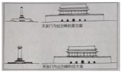 7.下图为天安门与纪念碑的原方案和现方案的对比示意图,请结合此图与“材料二”、“材料三”的相关内容,具体分析原方案的不足。(6分)