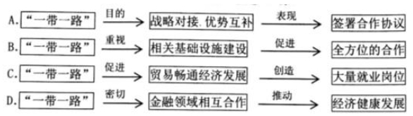 材料一:2015年3月,中国政府发布了《推动共建丝绸之路经济带和21世纪海上丝绸之路的愿景与行动》。目前,中国已经同40多个国家和国际组织签署了合作协议,实现政策和规划对接。“‘一带一路’建设不是另起炉灶、推倒重来。”习近平主席在“一带一路”国际合作高峰论坛开幕式的演讲中这样强调,‘而是实现战略对接、优势互补。”4年来,基础设施建设始终是实施“一带一路”的重点。中国同相关国家密切合作,推动陆海空通道和信息高速路的全面联接。地区性和跨地区的交通网络大大提高了物流效率,为贸易、投资铺平了道路,也为进一步的发展和全方位合作奠定了基础。2014~2016年,中国同“一带一路”沿线国家贸易总额超过3万亿美元。中国企业已经在20多个国家建设56个经贸合作区,为有关国家创造近11亿美元税收和18万个就业岗位。金融领域的密切合作也创造了更稳定的融资环境,这有利于引导各类资本参与实体经济发展,推动了世界经济健康发展。