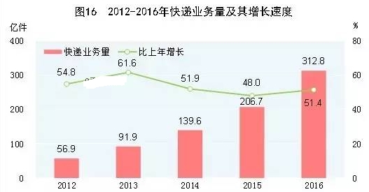 A.从2013年到2016年,我国快递业务量急剧增加,由91.9亿件增长至312.8亿件,但逐年增长速度持续下降。