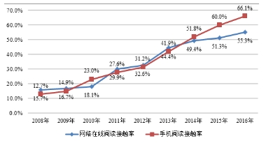 2016年我国成年国民的网络在线阅读接触率和手机阅读接触率有所上升,其他数字化阅读方式的接触率有所下降。历年网络在线阅读接触率、手机阅读接触率如下图: