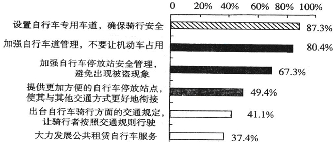 (材料摘编自2017年9月13日《山西经济日报》《自行车出行:路在何方?》,图表来源于李振宇、尹志芳、廖凯、李超《北京居民自行车出行意愿调查与发展对策》)