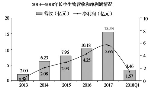 A.根据图一可知,长生生物的营收和净利润自2013至2017年逐年提高,其中2017年营收达到15.53亿元,净利润达到5.66亿元。