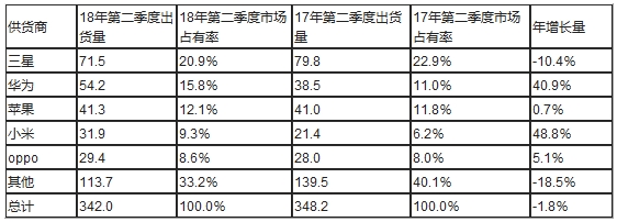 互联网数据中心公布的2018年第二季度全世界的智能手机排名前五的出货量(以百万为单位)、市场占有率和年增长数据。
