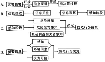 学者 Michael K..Perry和 Ronald W.Perry提出的防范行为决策模型( Protective Action Decision Model,简称PADM)提出了关于公众在面对灾害预警时一般表现出来的序列式反应。当灾害预警经由环境或社会通过某种渠道传递出来之后,实际上个人的前决策过程即已开始。预警信息本身不会自发地启动适当的防护型行动,只有当公众接收、关注并且准确理解了预警信息,防范行为才可能会发生。在这一前提下,个体开始进入感知阶段,分别是危险感知(发生概率和结果的感知)、危险应对感知(可选用的防范行为感知)和社会利益相关者感知(影响其行动选择的利益相关者感知)。这些感知为防范行为决策奠定了基础,其结果是与环境因素一道促成了最终的应对行为的形成。其中环境因素或推动公众采取其本不欲施行的应对行为,或阻碍公众采取其欲进行的应对策略。