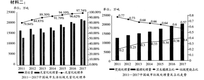C.据材料二可知,我国城市垃圾处理以焚烧、填埋为主,这两种方式中,填埋是主要方式,占比一直在 50%以上,不过呈下降趋势。