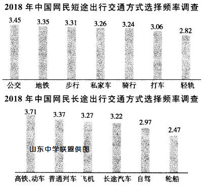 B.从材料二中2018年的调查数据来分析,网民们在短途出行中所选择的各类交通方式的频率相差不大,其中轻轨的使用频率最低。