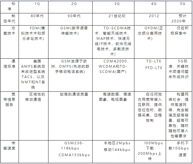 从20世纪80年代以来,全球无线通信大约以每10年一个周期的进度经历了从1G-4G的变迁。1984年,基于模拟蜂窝技术的1G无线通信出现。1990年开始,2G主流技术标准GSM和CDMA One相继发布,全球进入数字通信时代;2000年,国际电信联盟(ITU)将WCDMA、CDMA2000、TD-SCDMA以及Wi-MAX确定为3G的四大主流无线接口标准;2010年, TDD-LTE和 FDD-LTE两种制式下的4G技术开始成熟并商用。