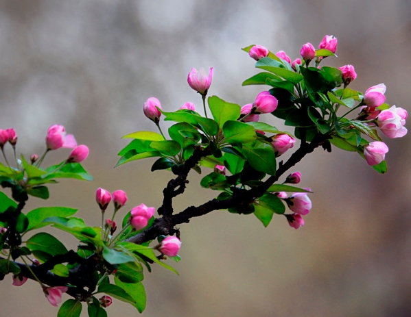 它的清新,它的传神,它的志趣,无一不感动着我。公历四月上、中旬,正是百花盛开的时候。当然,最早开放的是桃杏了。故有“占断春风是此花”(唐·白敏中)和“红杏枝头春意闹”(宋·宋祁)的歌咏。海棠,开放略晚,先叶后花。当那嫩绿的叶片重重叠起的时候,它的花蕾也才刚刚绽裂花萼,露出花瓣的点点鲜红。作者所赋的就是这时的海棠。我特别赞叹作者抓取的时机是那么的准确,观察的是如此细致!然而作者的本意却在后面两句,赞扬海棠的矜持高洁,不趋时,不与群芳争艳。这正是作者自己精神的写照。